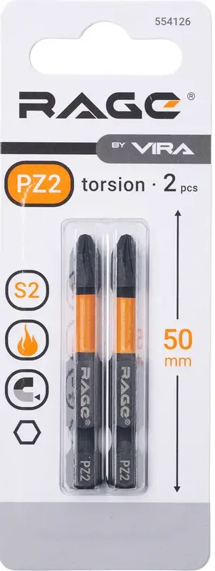 Биты торсионные S2 PZ2x50мм 2шт. RAGE by VIRA
