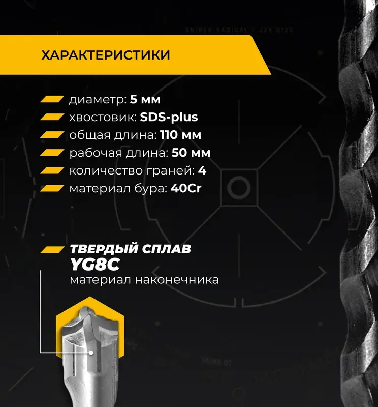 Бур изготовлен из высокоуглеродистой стали, что повышает прочность и долговечность инструмента. Также бур имеет твердосплавные YG8С резцы, которые делают бур устойчивым к разрушениям.