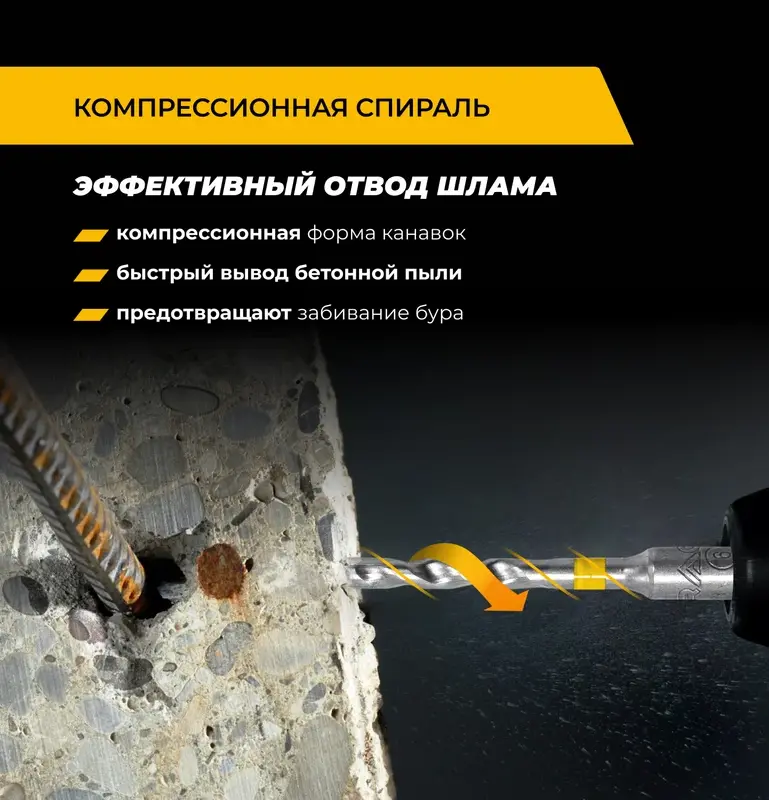 Бур предназначен для ударного сверления отверстий в твердых материалах (армированный бетон, бетон, гранит, камень, кирпич). Основным преимуществом данного бура является возможность сверлить арматуру. Благодаря своей конструкции и специальной заточке, при попадании на арматуру нагрузки распределяются таким образом, что позволяет буру пройти арматуру без заклинивания. Бур имеет проточки ведущие от каждого резца в компрессионную спираль, в совокупности наиболее эффективно отводящие шлам. Бур изготовлен из высокоуглеродистой стали, что повышает прочность и долговечность инструмента. Также бур имеет твердосплавные YG8С резцы, которые делают бур устойчивым к разрушениям. Предназначен для ударных дрелей и перфораторов с типом крепления SDS-plus. Центрирующее острие обеспечивает точность позиционирования.
