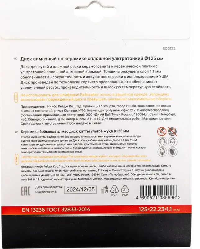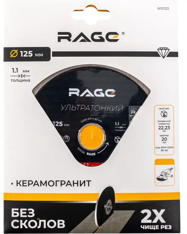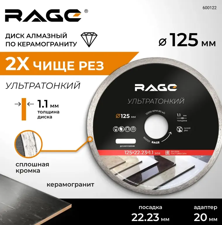 Диск алмазный 125 мм, 1,1мм по керамограниту и керамике сплошной ультратонкий RAGE 600122; УТ-00000250