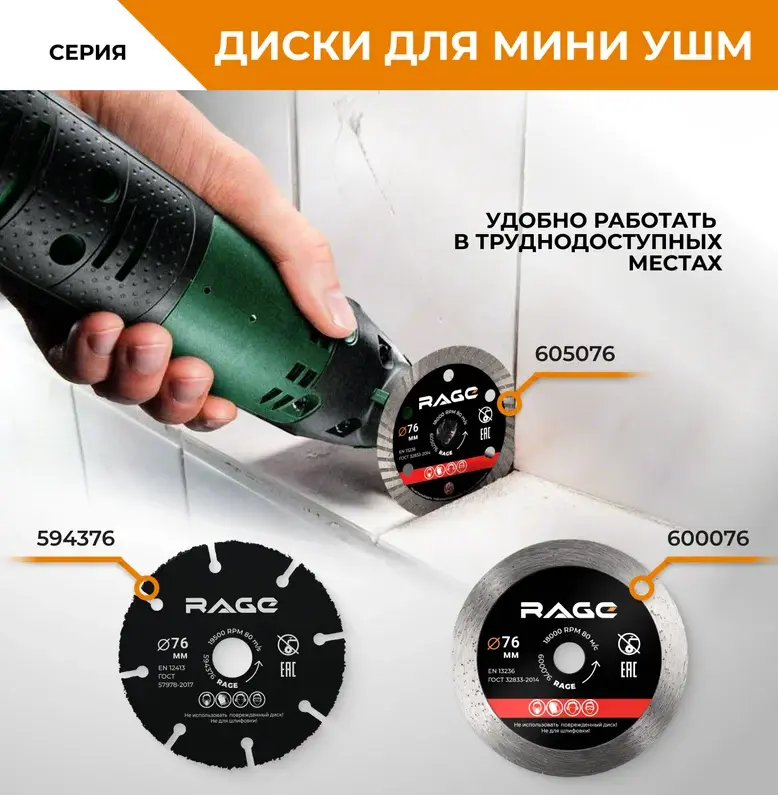 Широкая профессиональная линейка алмазных дисков для любых целей RAGE by VIRA - доверьтесь качеству: RAGE не подведет! ГОСТ 32833-2014