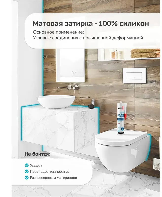 Герметик-затирка KUDO® рекомендуется для формирования межплиточных швов, уплотнений вокруг ванн, раковин, бассейнов, герметизации примыканий сантехнического оборудования к облицовке, герметизации швов при монтаже окон, дверей, стеклянных конструкций. Образует прочный долговечный шов, после отверждения сохраняет деформационную подвижность до ±25%, не собирает пыль, устойчив к атмосферным воздействиям и температурным перепадам. Тиксотропный, не растекается и не сползает по шву.