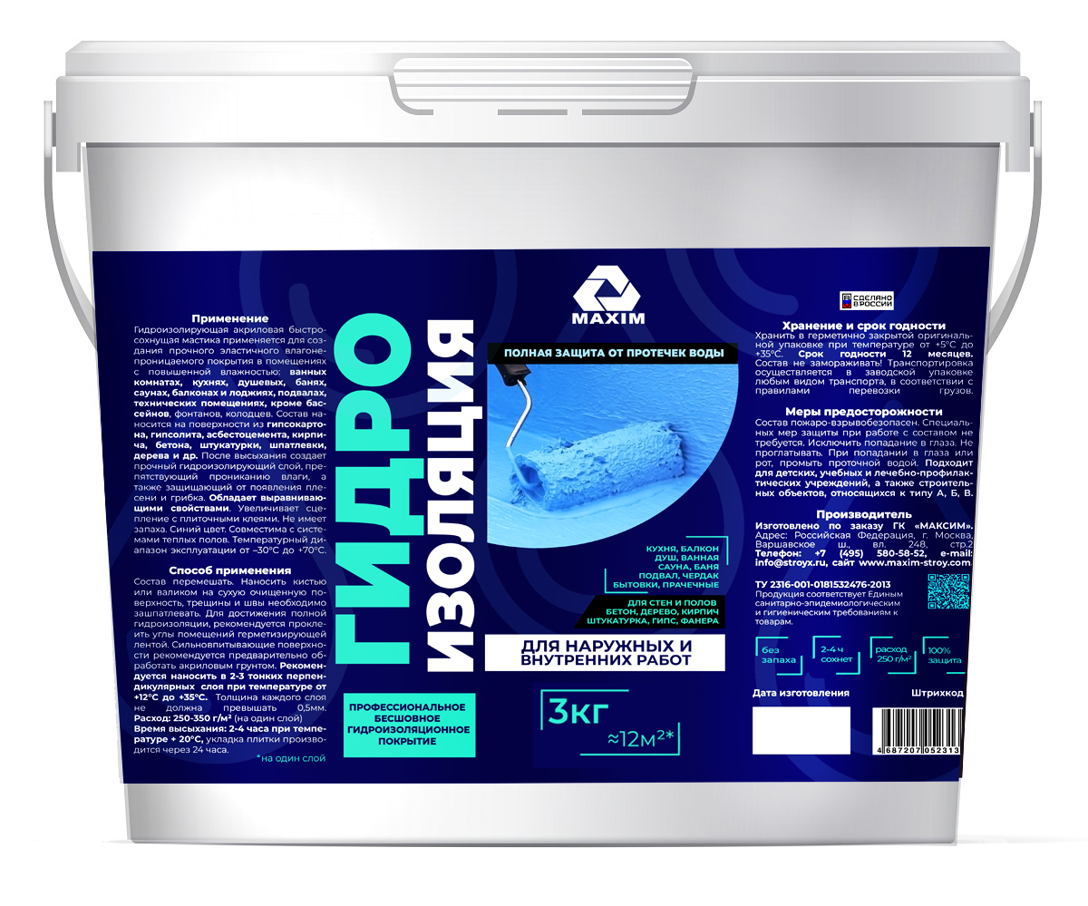 Гидроизолирующая акриловая быстросохнущая мастика MAXIM применяется для создания прочного эластичного влагонепроницаемого покрытия в помещениях с повышенной влажностью: ванных комнатах, кухнях, душевых, банях, саунах, балконах и лоджиях, подвалах, технических помещениях, кроме бассейнов, фонтанов, колодцев.Состав наносится на поверхности из гипсокартона, гипсолита, асбестоцемента, кирпича, бетона, штукатурки, шпатлевки, дерева и др. После высыхания создает прочный гидроизолирующий слой, препятствующий прониканию влаги, а также защищающий от появления плесени и грибка. Обладает выравнивающими свойствами. Увеличивает сцепление с плиточными клеями. Не имеет запаха. Синий цвет. Совместима с системами теплых полов. Температурный диапазон эксплуатации от –30°С до +70°С.