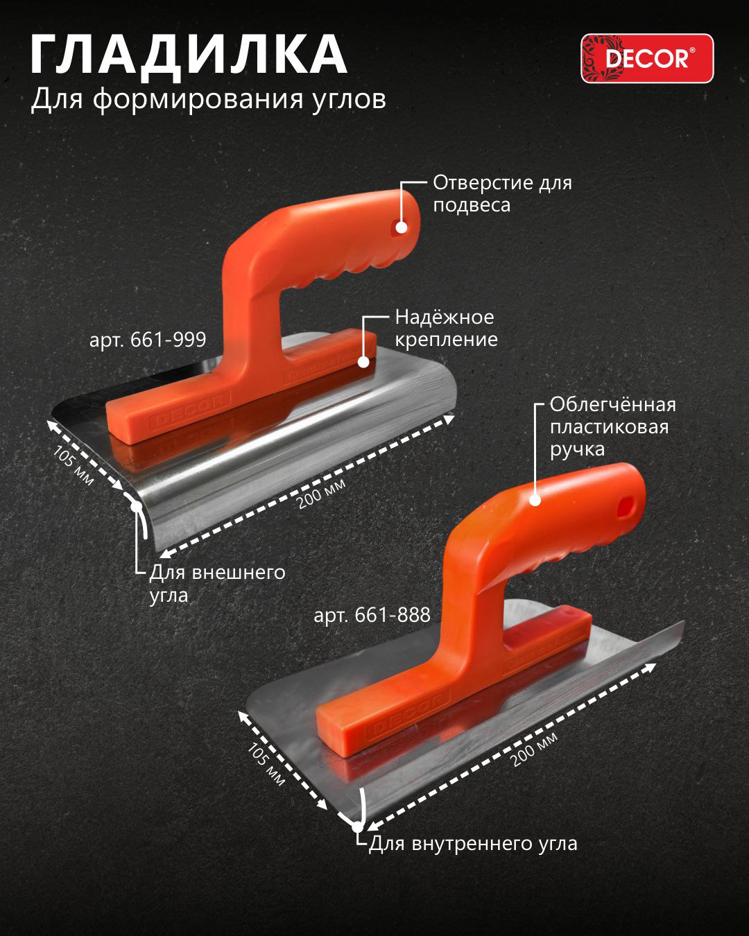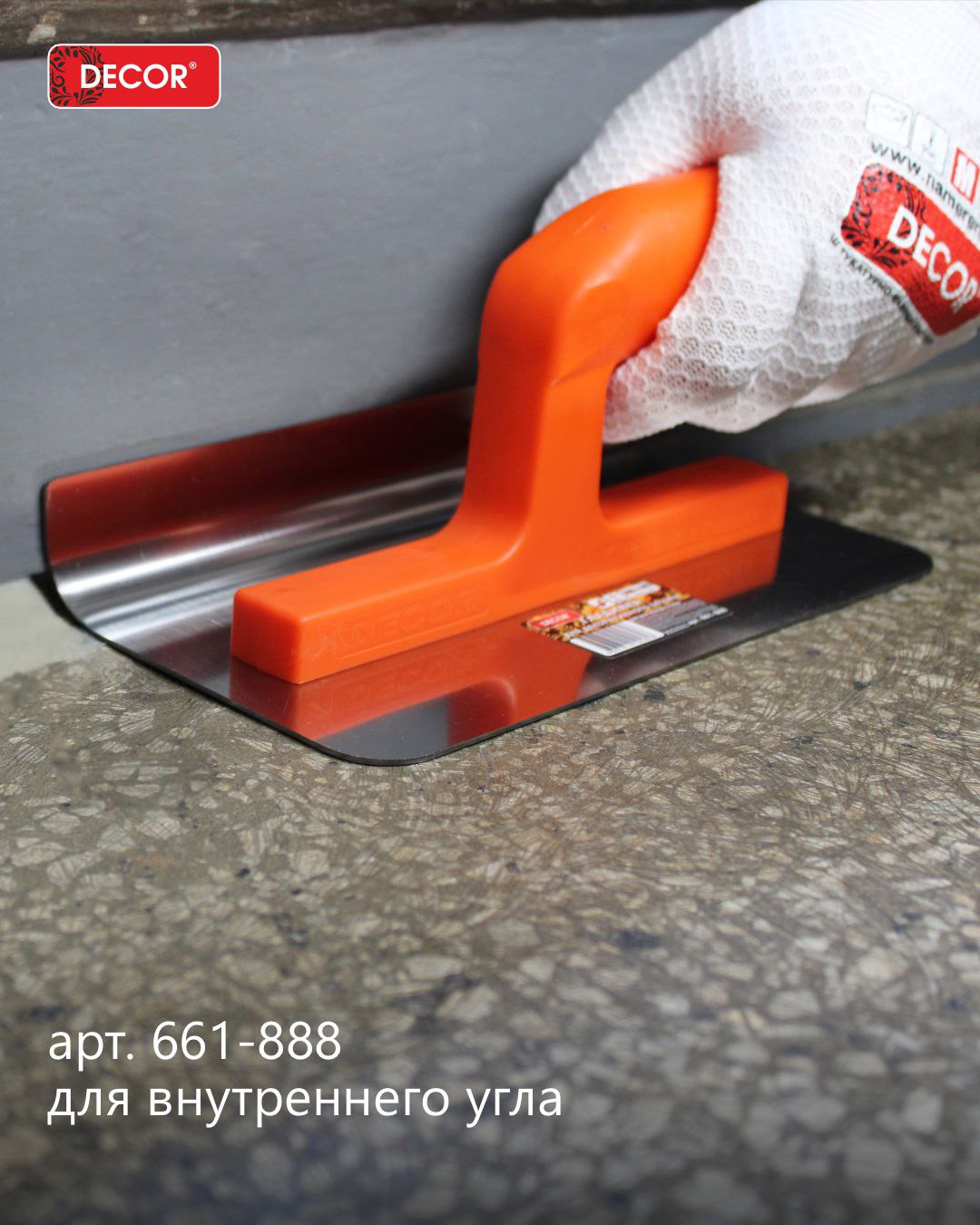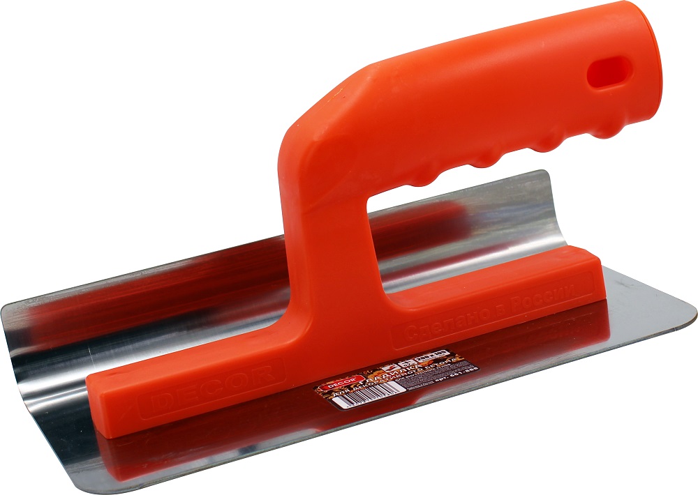 Гладилки DECOR используются при проведении декоративных работ. Гладилка для нанесения и распределения клея для плитки, кафеля и керамогранита. Закруглённый угол исключает задир смеси.Преимущества гладилок DECOR: