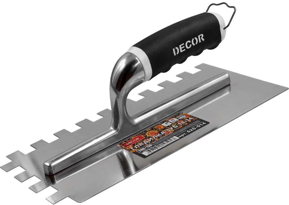 Гладилки DECOR используются при проведении декоративных работ. Гладилка для нанесения и распределения клея для плитки, кафеля и керамогранита. Зубья размером 14x14 мм обеспечивают оптимальный слой клея, улучшая адгезию для больших форматов кафеля.Преимущества гладилок DECOR: