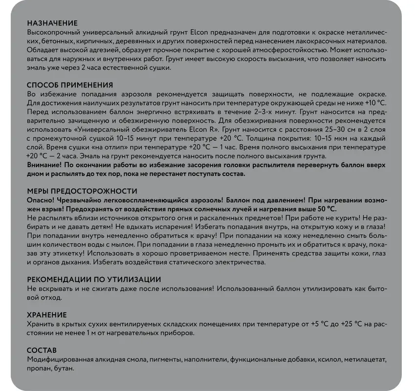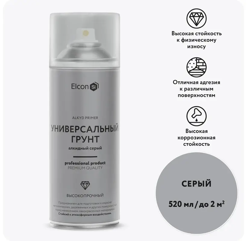 Грунтовка алкидная высокопрочная универсальная серый аэрозоль 520 мл Elcon 00-00463216; 11613559