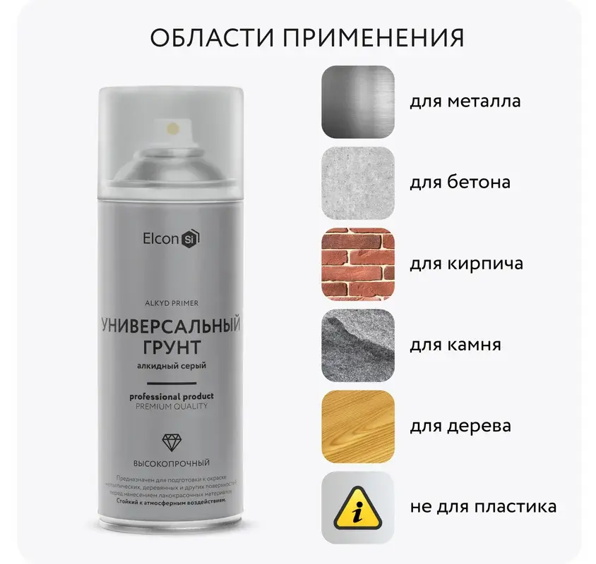Высокопрочный универсальный алкидный грунт Elcon предназначен для подготовки к окраске металлических, бетонных, кирпичных, деревянных и других поверхностей перед нанесением лакокрасочных материалов. Обладает высокой адгезией, образует прочное покрытие с хорошей атмосферостойкостью. Может использоваться для наружных и внутренних работ.