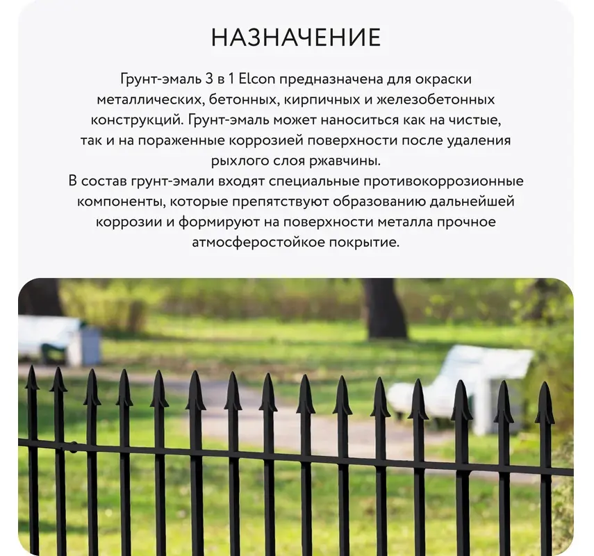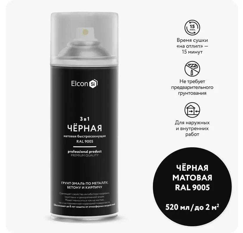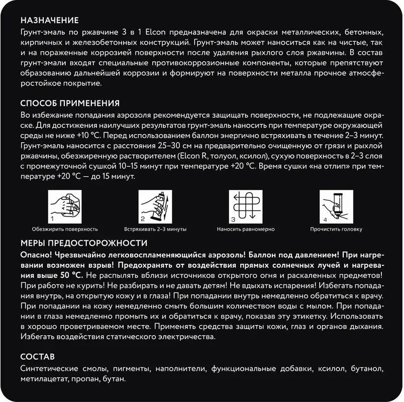 Грунт-эмаль по ржавчине 3 в 1 Elcon матовая, черная, 520 мл, аэрозоль 00-00462565 предназначена для нанесения как на чистые, так и на пораженные коррозией металлические поверхности с целью создания надежной антикоррозионной защиты металлоконструкций, оборудования, металлических изделий. Грунт-эмаль 3 в 1 Elcon сочетает в себе функциональные свойства преобразователя ржавчины, антикоррозионного грунта и декоративной эмали.