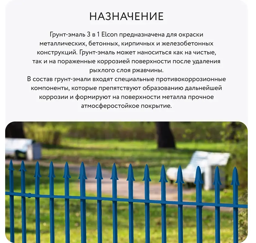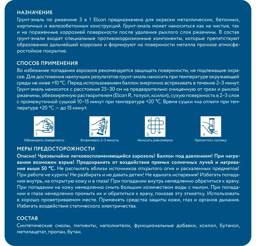 Грунт-эмаль по ржавчине 3 в 1 Elcon матовая, черная, 520 мл, аэрозоль 00-00462565 предназначена для нанесения как на чистые, так и на пораженные коррозией металлические поверхности с целью создания надежной антикоррозионной защиты металлоконструкций, оборудования, металлических изделий. Грунт-эмаль 3 в 1 Elcon сочетает в себе функциональные свойства преобразователя ржавчины, антикоррозионного грунта и декоративной эмали.