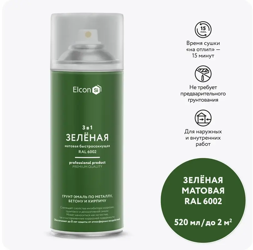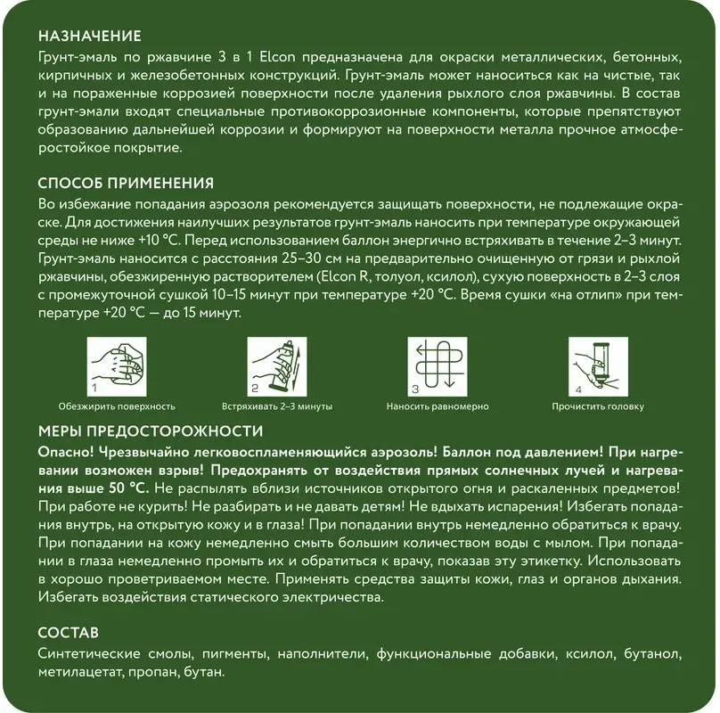 Грунт-эмаль по ржавчине 3 в 1 Elcon матовая 520 мл, аэрозоль предназначена для нанесения как на чистые, так и на пораженные коррозией металлические поверхности с целью создания надежной антикоррозионной защиты металлоконструкций, оборудования, металлических изделий. Грунт-эмаль 3 в 1 Elcon сочетает в себе функциональные свойства преобразователя ржавчины, антикоррозионного грунта и декоративной эмали.