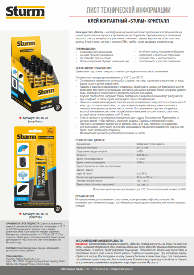Клей контактный КРИСТАЛЛ прозрачный 30мл в блистере 12шт STURM 08-18-38; УТ-00000142