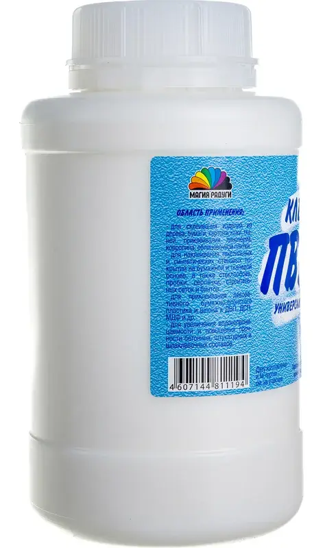 Клей ПВА универсальный - применяется для склеивания изделий из бумаги, картона, кожи, тканей. Подходит для приклеивания линолеума, ковролина, облицовочной плитки, синтетических стеновых покрытий на бумажной основе, стекловолоконных, виниловых и бумажных обоев, пробки, серпянки, строительных сеток и бинтов. Может использоваться для приклеивания декоративного бумажно-слоистого пластика к ДВП, ДСП, МДФ и др., а также для увеличения водонепроницаемости и повышения прочности бетонных, штукатурных и шпатлевочных составов.