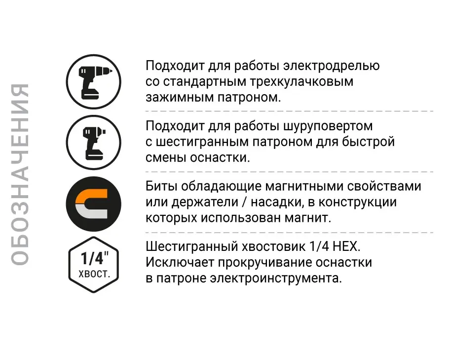 Шестигранный хвостовик ¼ HEX исключает проскальзывание оснастки в патроне электроинструмента.