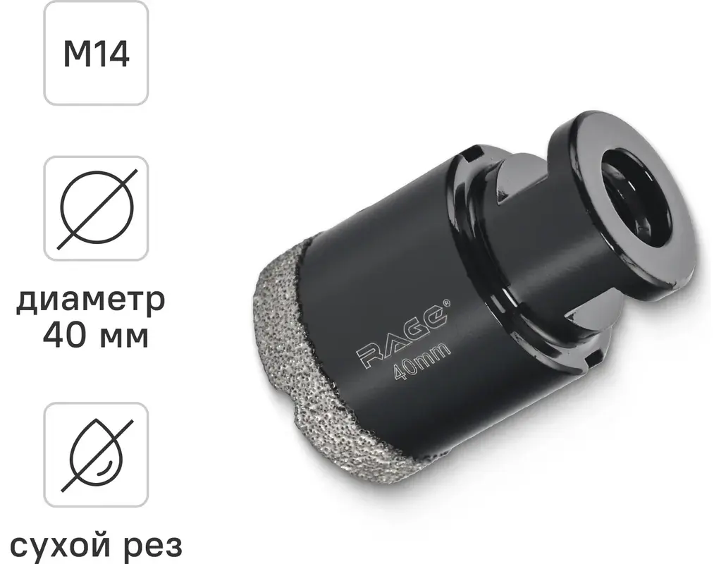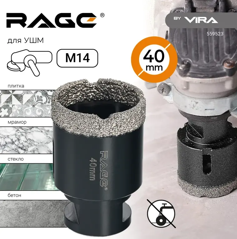 Коронка алмазная 40 мм по керамограниту для УШМ, сухое сверление RAGE 559523; УТ-00000232