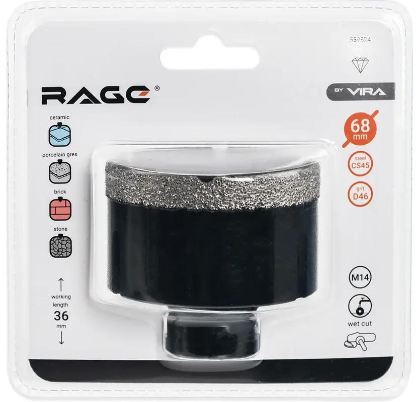 Коронка алмазная 68 мм по керамограниту для УШМ, сухое сверление RAGE 559524; УТ-00000234