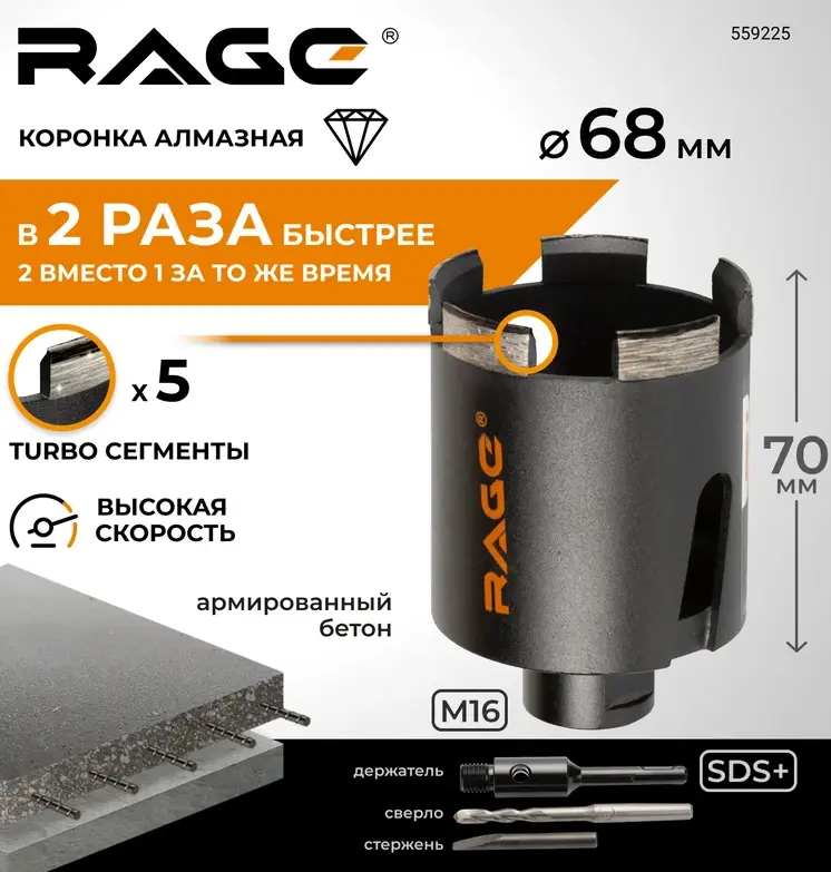 Коронка алмазная по бетону 68 мм для подрозетников RAGE 559225; УТ-00000197