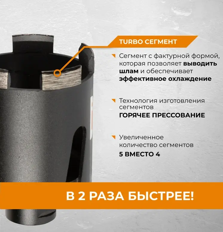 Коронка предназначена для работы с помощью перфоратора в безударном режиме в армированном бетоне (максимальный диаметр арматуры 22 мм), бетоне, кирпиче, силикатном кирпиче и камне. Центрирующее сверло помогает обеспечить точное позиционирование и сверлить без отклонений. Увеличенное количество сегментов (5шт.) способствует повышению скорости сверления и делает коронку более устойчивой к механическому разрушению, т.к. снижает возможность удара о армирующие элементы. В конструкции предусмотрены заостренные зубцы для быстрого вхождения в материал и точного расположения отверстий. При работе с водным охлаждением удается избавиться от шлама и получить ровный рез. Также в коронке предусмотрены компенсационные отверстия, которые позволяют погасить вибрацию, значительно снизить уровень шума при работе и способствуют быстрому охлаждению инструмента.