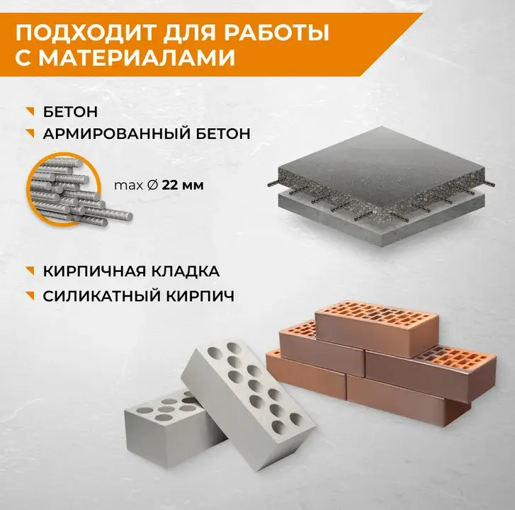 Назначение: предназначена для сверления отверстий в армированном бетоне с максимальным диаметром арматуры 22 мм, бетоне, кирпиче, силикатном кирпиче, камне.