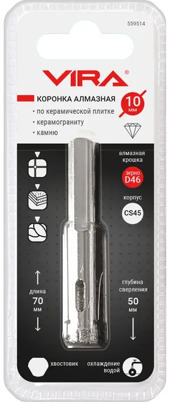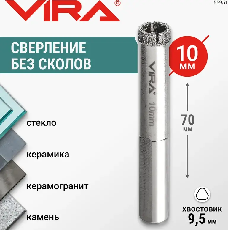 Коронка алмазная по керамике 10 мм трехгранный хвостовик VIRA 559514; УТ-00000200
