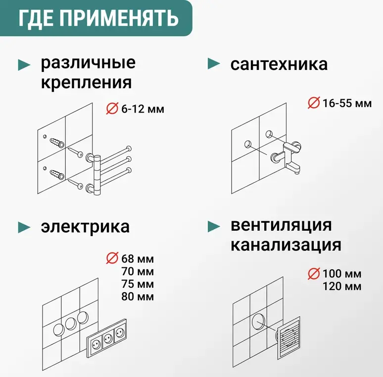 - Назначение: для сверления отверстий в керамограните, керамической плитке и камне, стекле