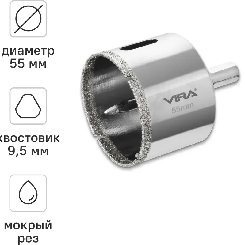 Коронка алмазная по керамике 55 мм трехгранный хвостовик VIRA 559507; УТ-00000219