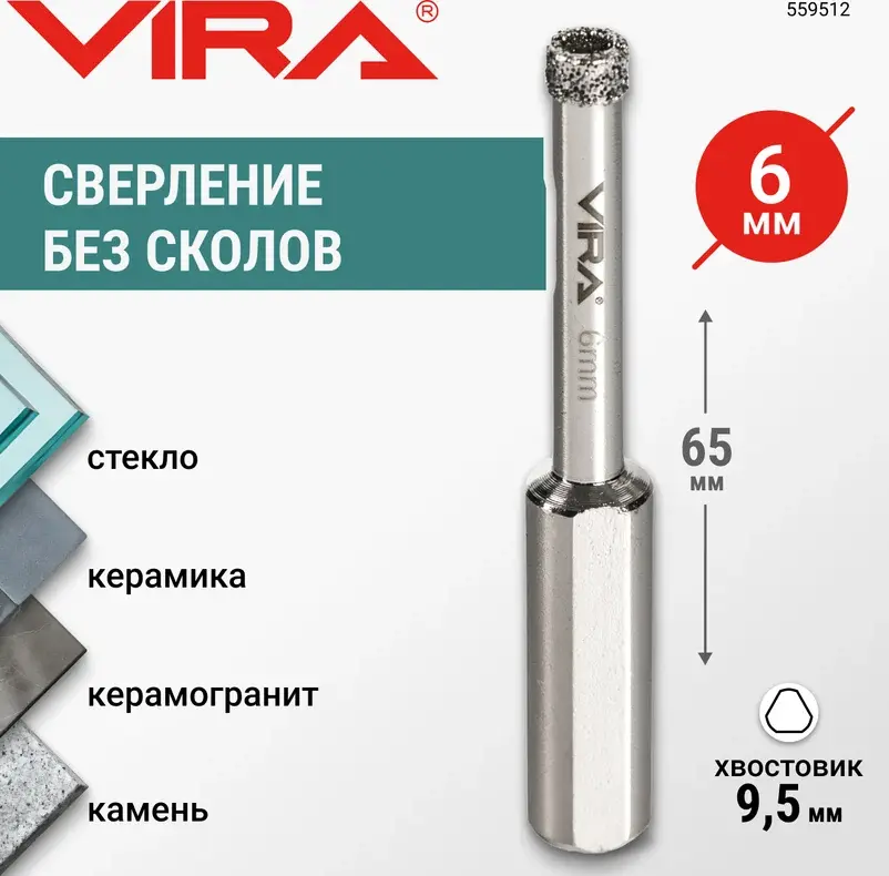 Коронка алмазная по керамике 6мм трехгранный хвостовик VIRA 559512; УТ-00000199