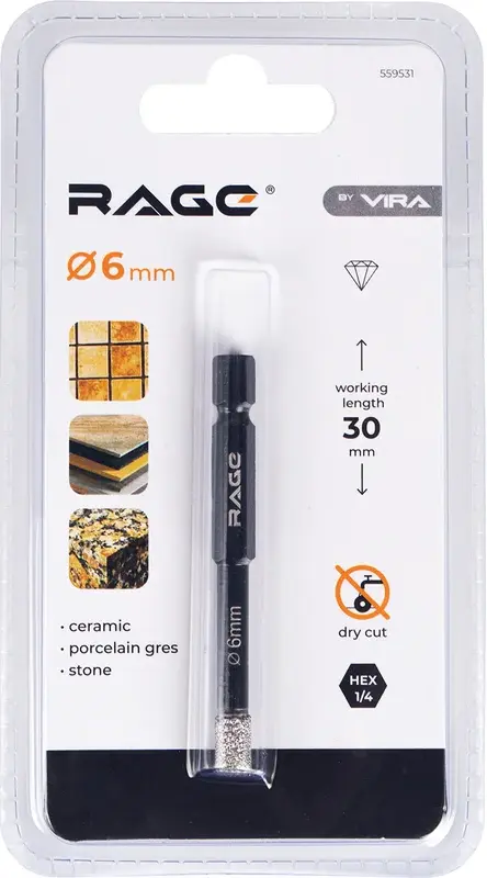 Коронка алмазная по керамограниту 6мм с шестигранным хвостовиком RAGE 559531; УТ-00000235