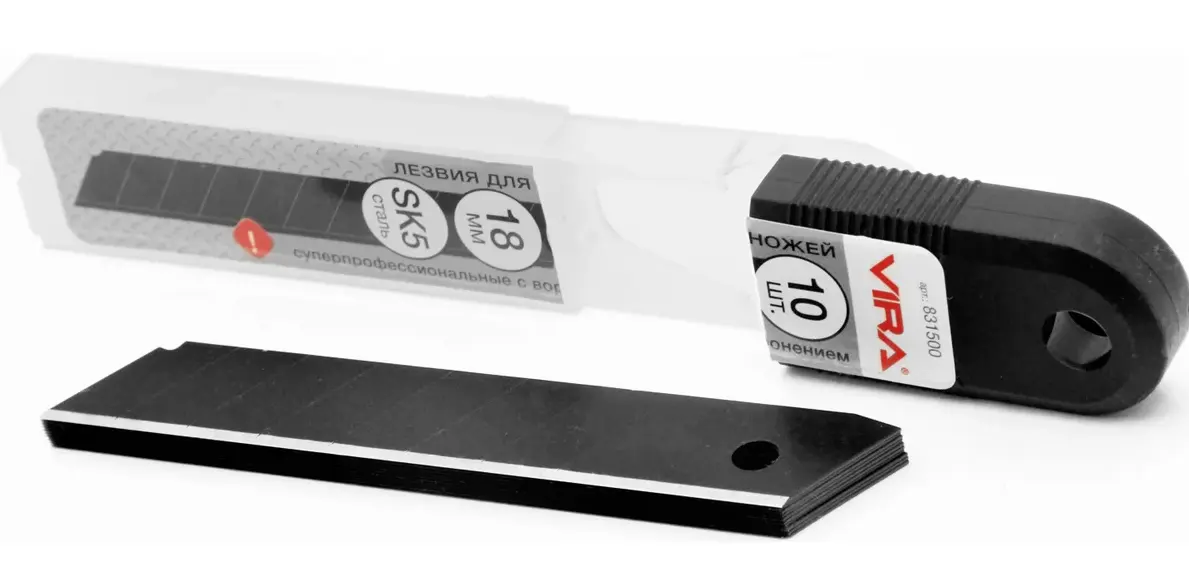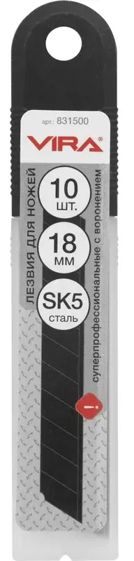 Лезвия для ножей сегментные с воронением 18 мм 10 шт., VIRA RAGE: Предназначены для разрезания бумаги, картона, пленки, ткани, резины; В комплекте 10 черных лезвий; Ширина полотна: 18 мм; Толщина: 0,5 мм; Длина: 100 мм; Материал: сталь SK5; Воронение лезвий служит для защиты от ржавчины.