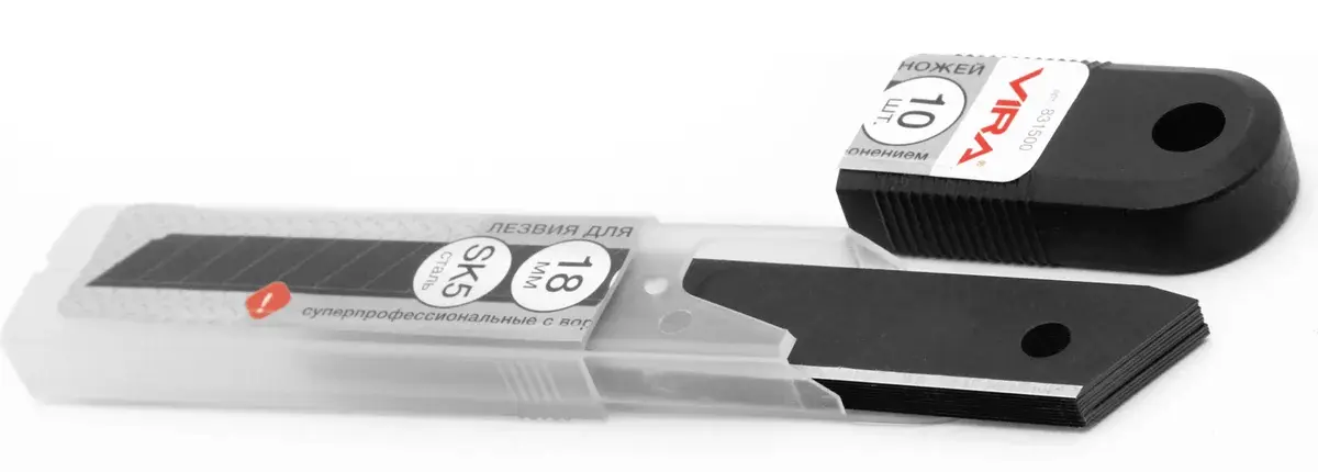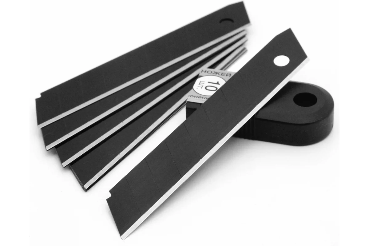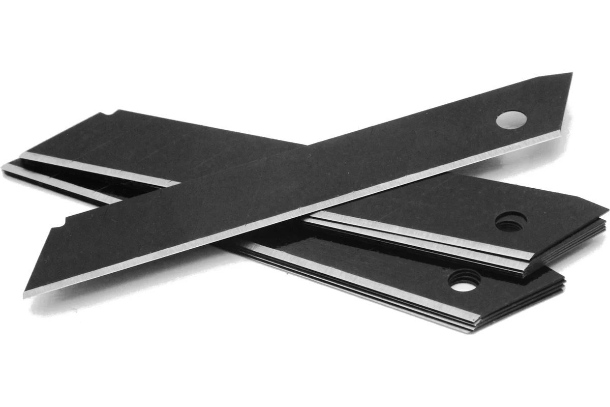 Набор запасных сменных лезвий для канцелярских и строительных ножей. Каждое лезвие имеет засечки для надлома затупившегося сегмента. Если лезвия долгое время пролежат плотно друг к другу или попадут во влажную среду – им не грозит разрушение.