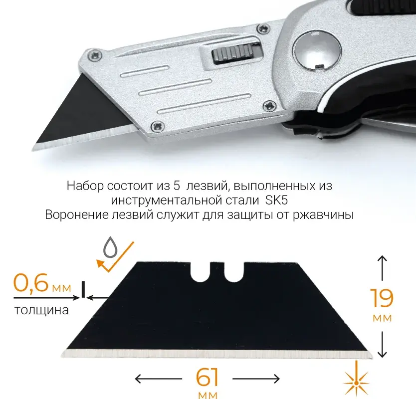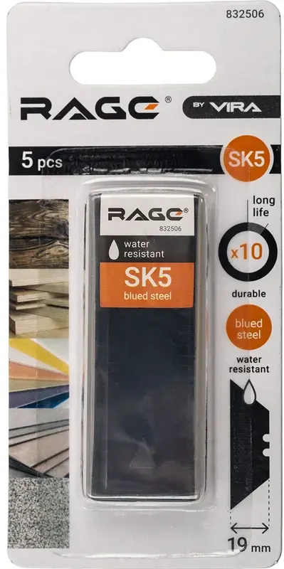 Лезвия для ножей трапециевидные вороненые 5 шт. RAGE by VIRA: Предназначены для разрезания бумаги, картона, пленки, ткани, резины, а также коврового покрытия, фанеры до 6 мм; В комплекте 5 черных лезвий; Выдерживают ударные нагрузки по дереву. Ширина: 19 мм; Длина: 61 мм; Толщина: 0.6 мм; Материал: сталь SK5; Воронение лезвий служит для защиты от ржавчины.