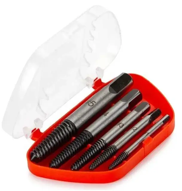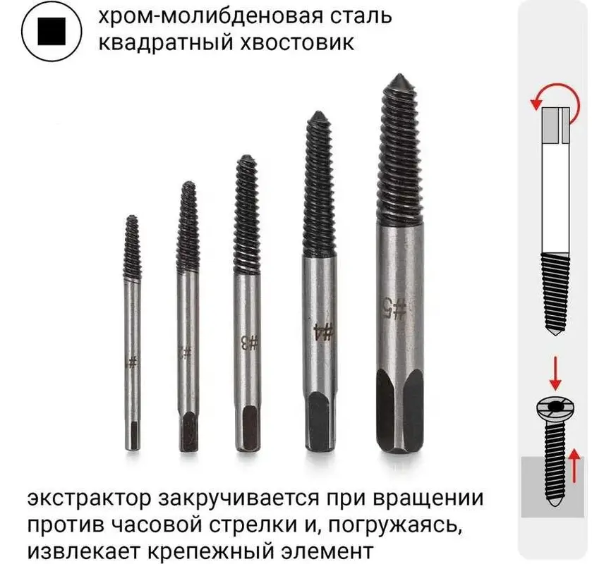 Набор экстракторов предназначен для извлечения сорванных или поврежденных иным образом резьбовых крепежных элементов (болтов, шпилек). Экстракторы подбираются по размеру, в соответствии с величиной поврежденного крепежа. Набор из 5 экстракторов изготовлен из хром-молибденовой стали 35CrMo, благодаря чему отличаются прочностью и долгим сроком службы. Экстракторы имеют квадратный хвостовик, прецизионный конический наконечник и подходят для извлекаемого крепежа имеющего резьбу в диапазоне M3-M18.