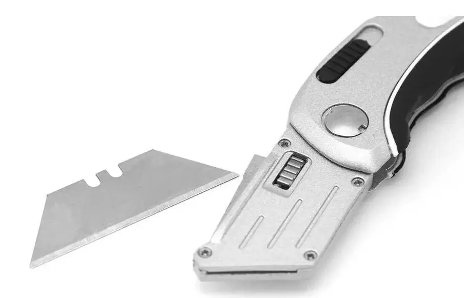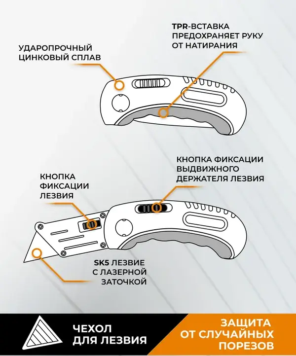 Нож универсальный складной обладает антикоррозийным эффектом благодаря цинковому покрытию алюминиевого корпуса. Ударопрочный корпус рассчитан на длительный срок службы, а также выдерживает удары и падения с высоты до 10 метров. Рукоятка имеет вставку TPR, которая предохраняет руку от натирания и способствует удобному хвату. Нож оснащен кнопками фиксации как самого лезвия, так и выдвижного держателя лезвия. Для сменного лезвия предусмотрен съемный защитный чехол. Трапециевидное складное лезвие - это незаменимый строительный инструмент для реза различных материалов любой плотности. Выполнено из особо острой стали SK5, что обеспечивает высокую степень остроты и долговечности. Трапециевидный нож, лезвие которого не ломается на сегменты, а имеет два режущих кончика. Трапециевидное лезвие также имеет лазерную заточку благодаря которой оно легко проникает в любые материалы, обеспечивая точный и чистый разрез.