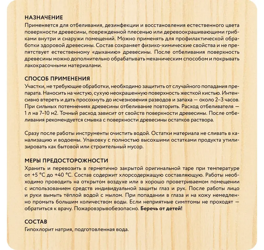 Применяется для отбеливания, дезинфекции и восстановления естественного цвета поверхности древесины, поврежденной плесенью или деревоокрашивающими грибами, внутри и снаружи помещений. Может применяться для профилактической обработки здоровой древесины. Состав сохраняет физико-химические свойства дерева и не мешает естественному дыханию. После отбеливания поверхность древесины можно дополнительно обрабатывать механическим способом и покрывать лакокрасочными материалами.