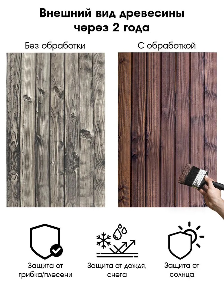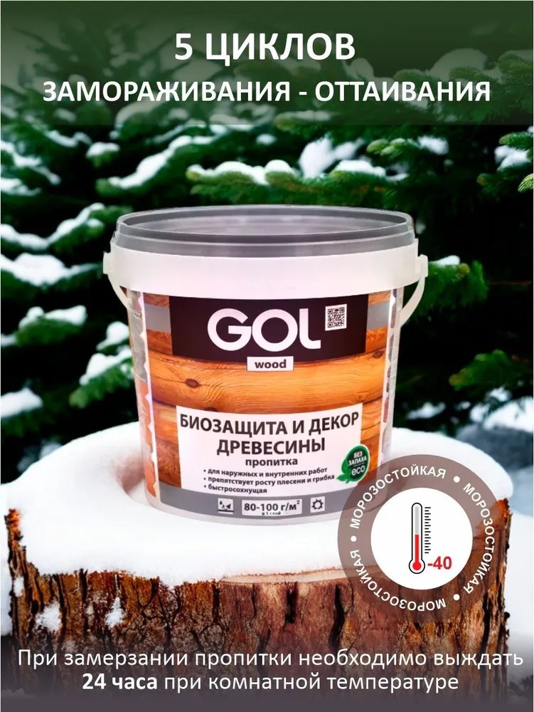 GOL wood AQUA обеспечивает защиту от атмосферных воздействий и биопоражений дерева и других материалов: снаружи - до 5 лет, внутри - до 10 лет (в зависимости от условий эксплуатации). Эта пропитка для дерева для наружных работ, при необходимости, разбавляется водой.