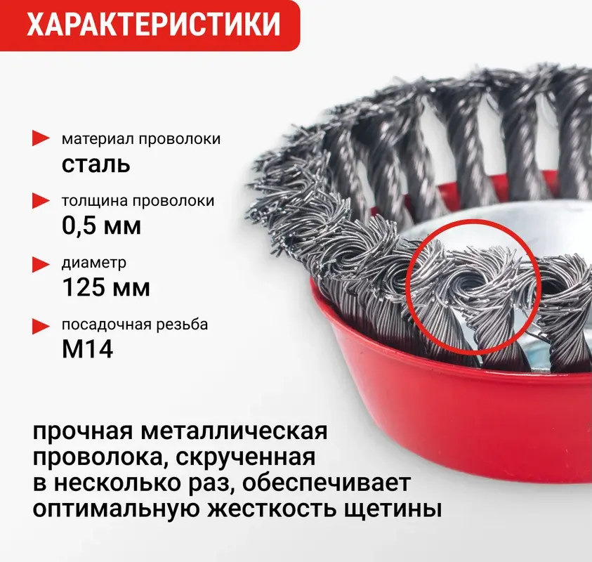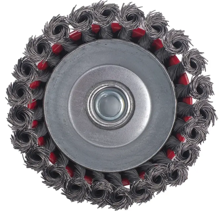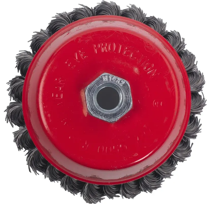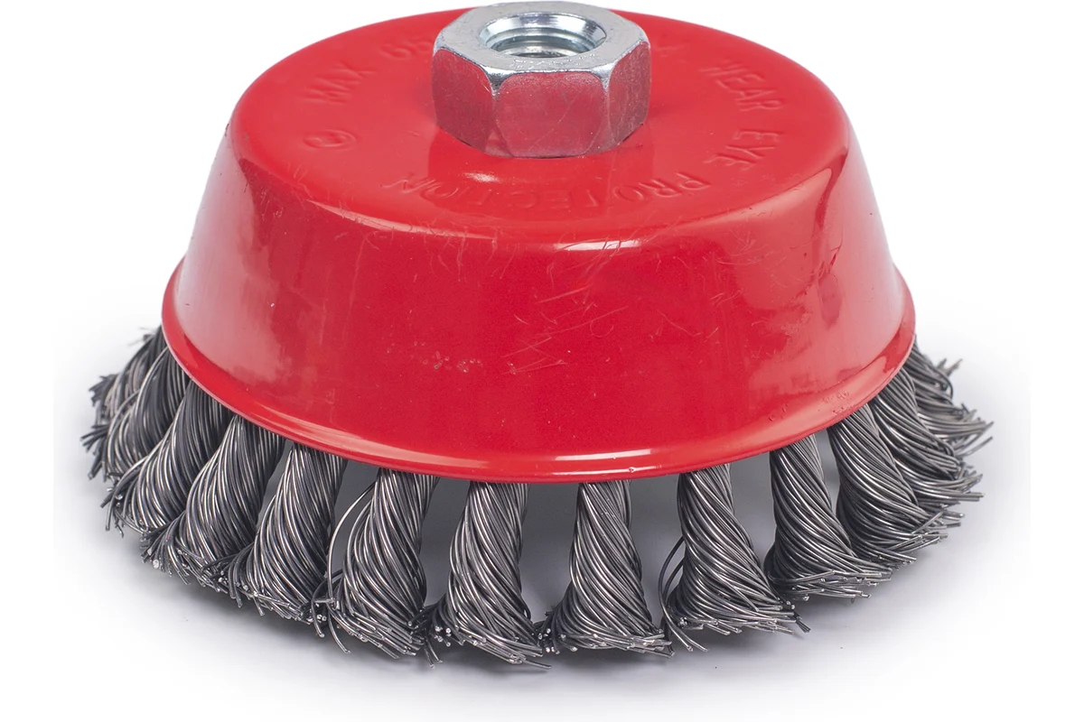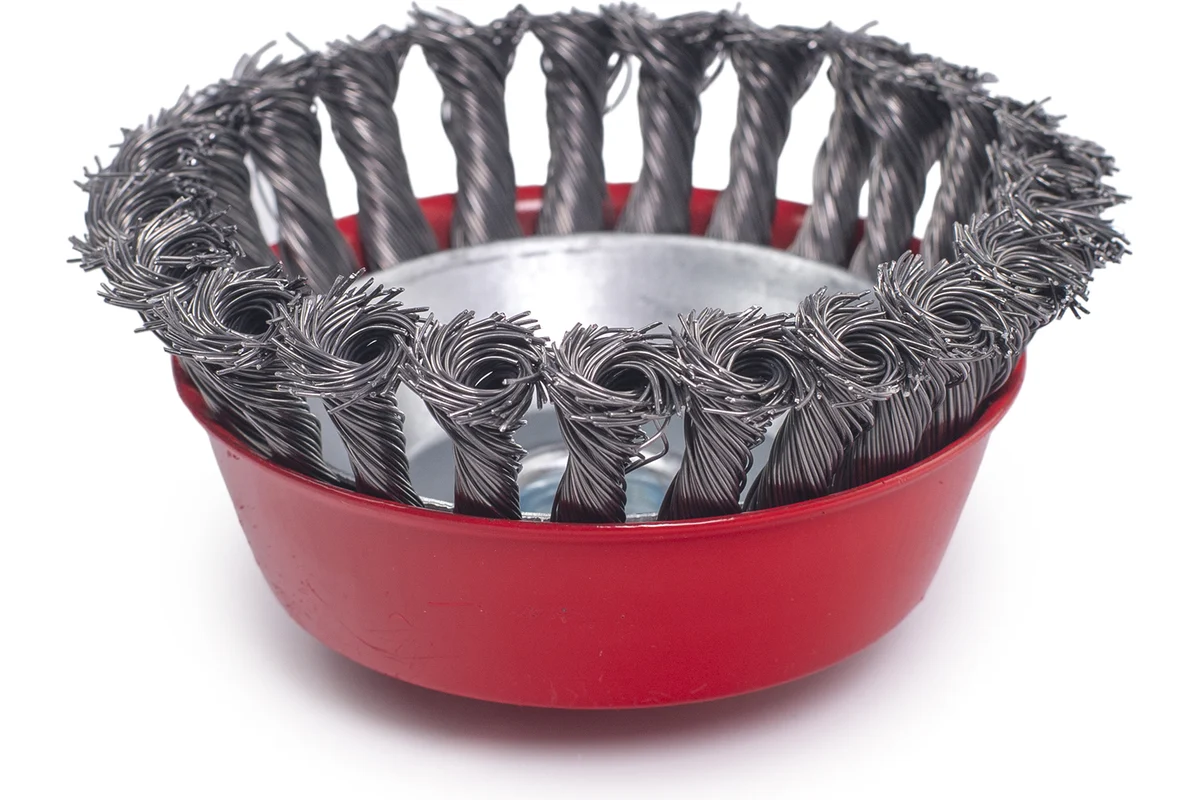 Щетка для УШМ чашка крученая предназначена для быстрой и интенсивной очистки больших поверхностей, удаления сварочной окалины, ржавчины, заусенцев. Прочная металлическая проволока, диаметром 0,5 мм, скрученная в несколько раз, обеспечивает оптимальную жесткость щетины и обеспечивает устойчивость к продолжительным работам в тяжелых условиях.
