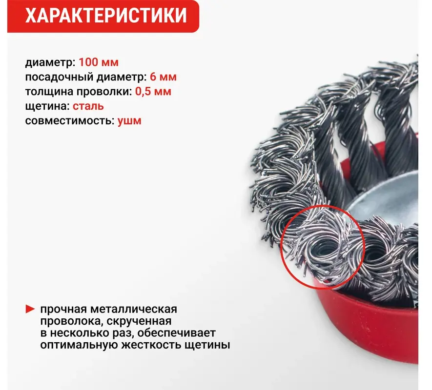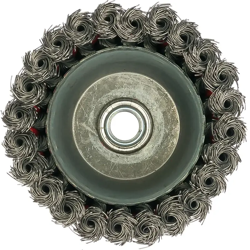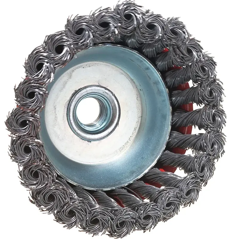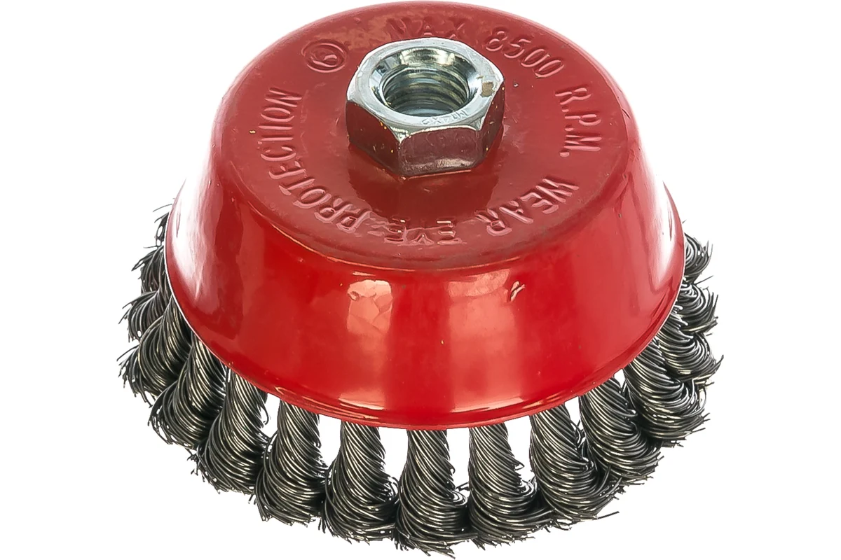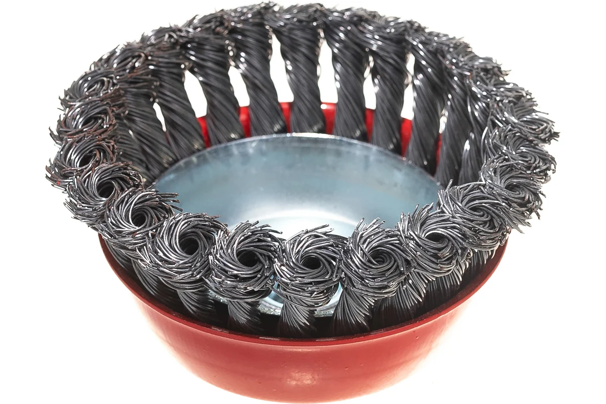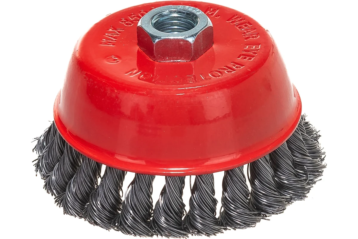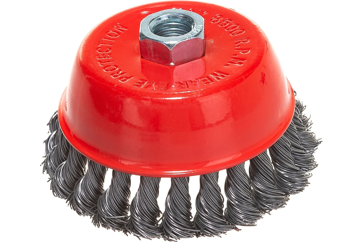 Щетина щетки изготовлена из витой стальной проволоки диаметром 0,45мм. Резьбовое посадочное место на шпиндель М14 позволяет с легкостью устанавливать щетку на угловые шлифмашины.