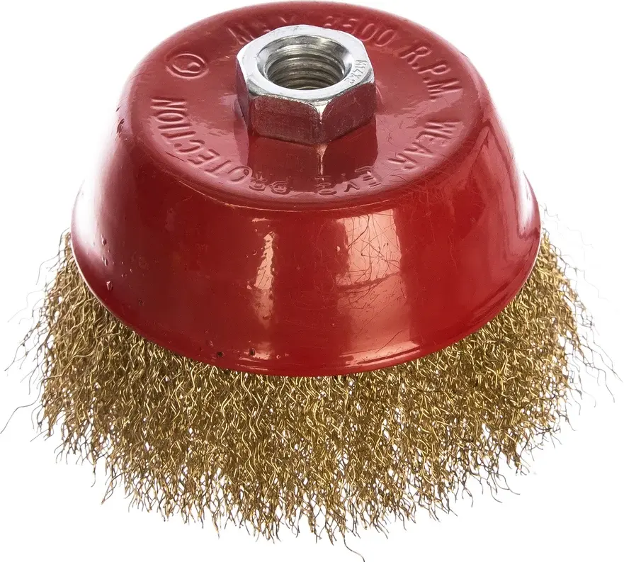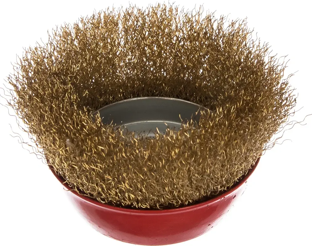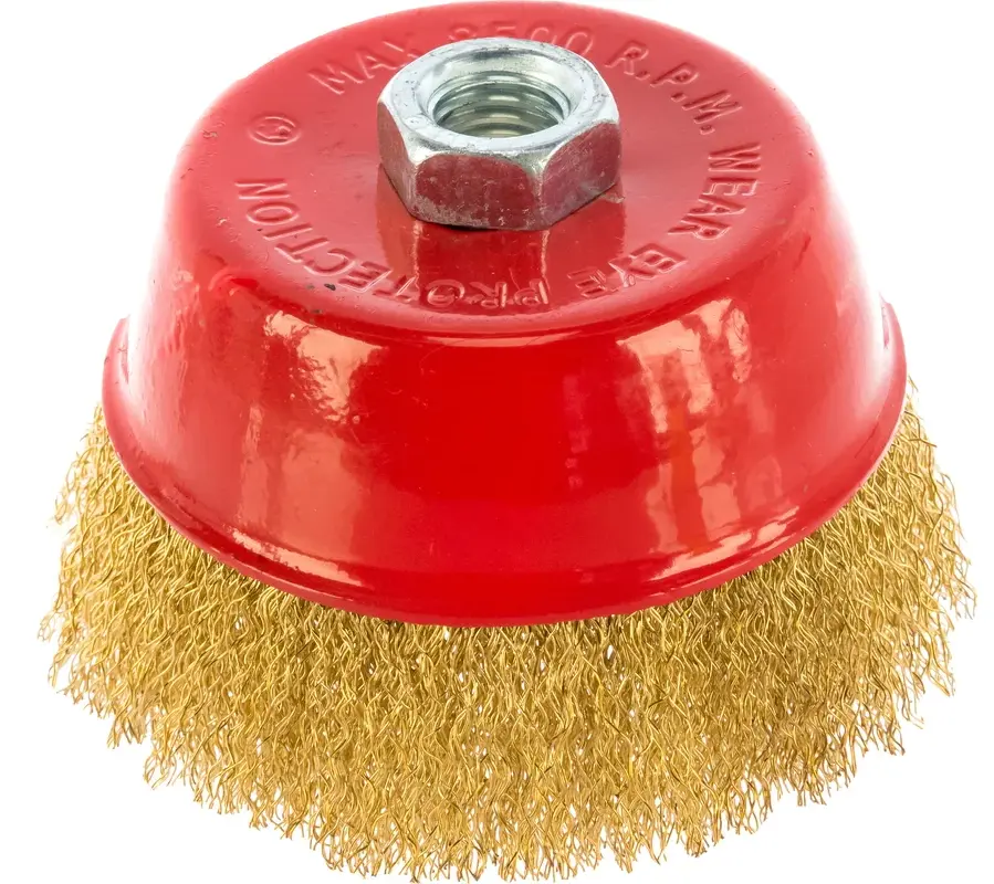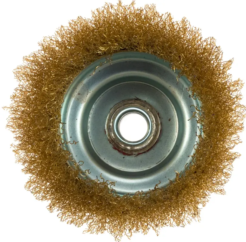 Щетина щетки изготовлена из гофрированнойлатунированной стальной проволоки диаметром 0,3мм. Резьбовое посадочное место на шпиндель М14 позволяет с легкостью устанавливать щетку на угловые шлифмашины.