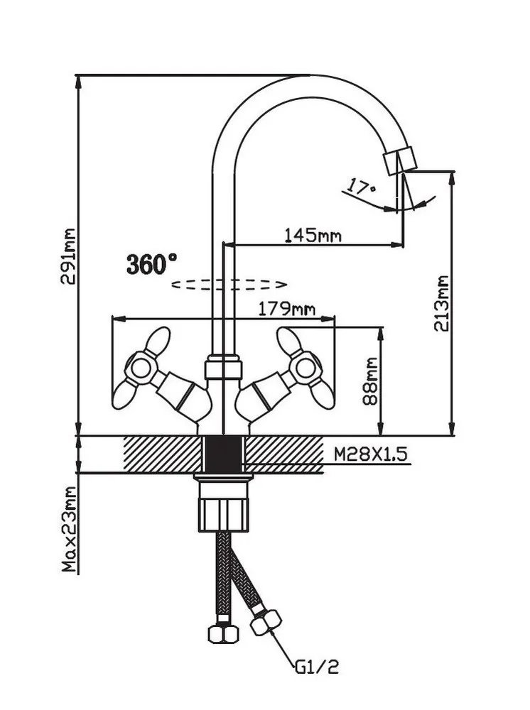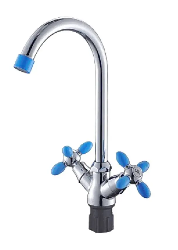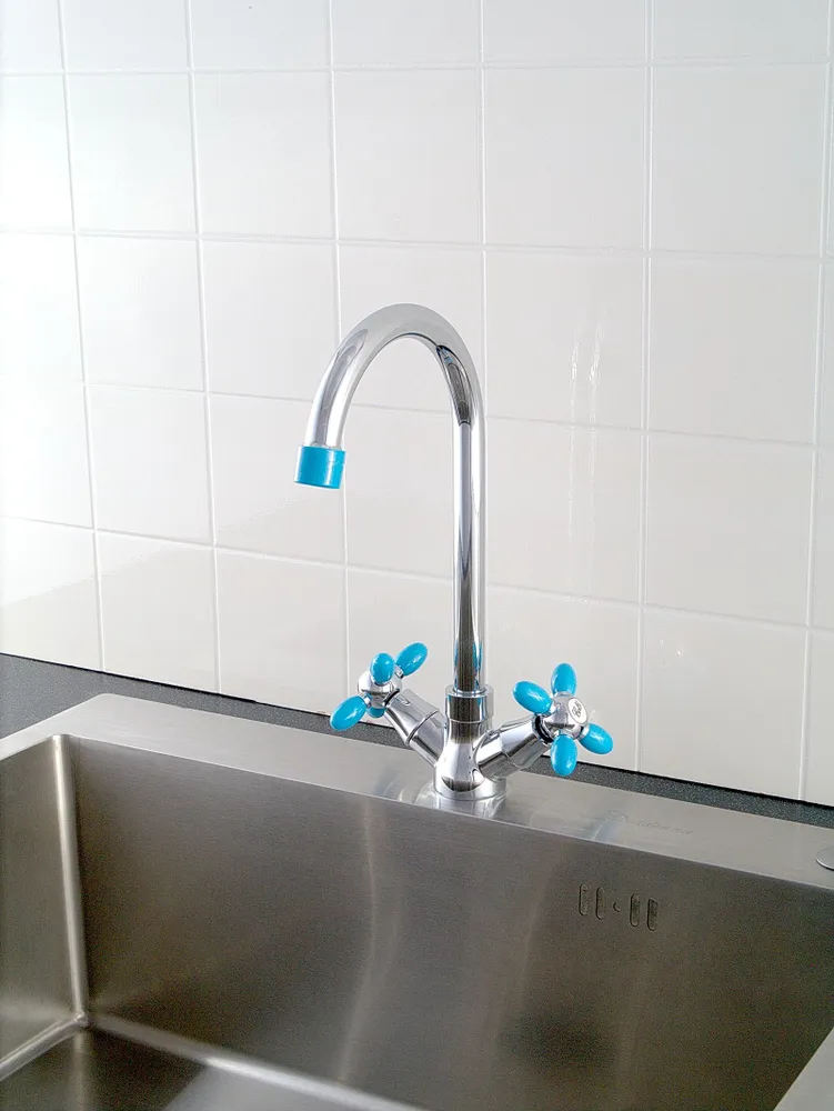 Смеситель для кухни изготовлен из высококачественного цинкового сплава. Хром-никелевое покрытие корпуса улучшает внешний вид, облегчает уход и продлевает срок службы смесителя. Излив смесителя высокий с аэратором. Пластиковая вставка аэратора не ржавеет, долго не покрывается известковым налётом и легко очищается. Для регулировки воды применяются латунные кран-буксы с керамическими пластинами и увеличенным сроком службы. Элементы ручек и аэратор синего цвета. На раковину смеситель крепится с помощью удобного крепежа на гайке. К воде подключается двумя гибкими подводками 1/2" длиной 35 см.