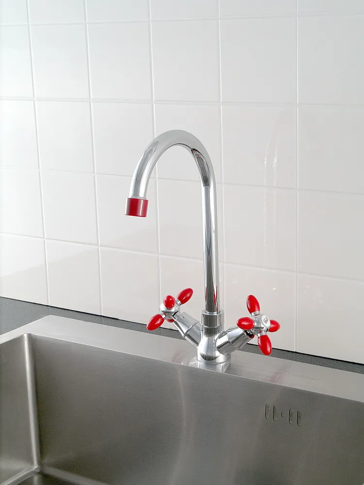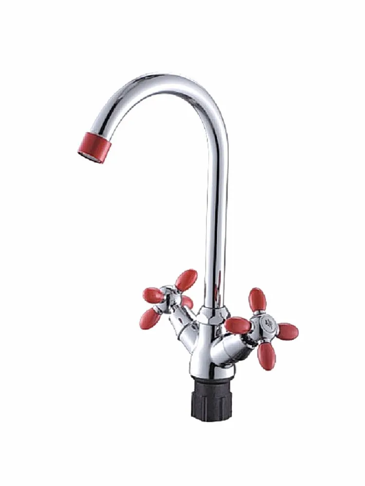 Смеситель для кухни изготовлен из высококачественного цинкового сплава. Хром-никелевое покрытие корпуса улучшает внешний вид, облегчает уход и продлевает срок службы смесителя. Излив смесителя высокий с аэратором. Пластиковая вставка аэратора не ржавеет, долго не покрывается известковым налётом и легко очищается. Для регулировки воды применяются латунные кран-буксы с керамическими пластинами и увеличенным сроком службы. Элементы ручек и аэратор красного цвета. На раковину смеситель крепится с помощью удобного крепежа на гайке. К воде подключается двумя гибкими подводками 1/2" длиной 35 см.