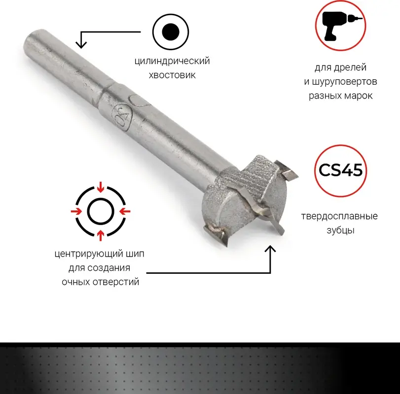 - Применение: для сверления глухих отверстий в древесине, ЛДСП, фанере, пластике