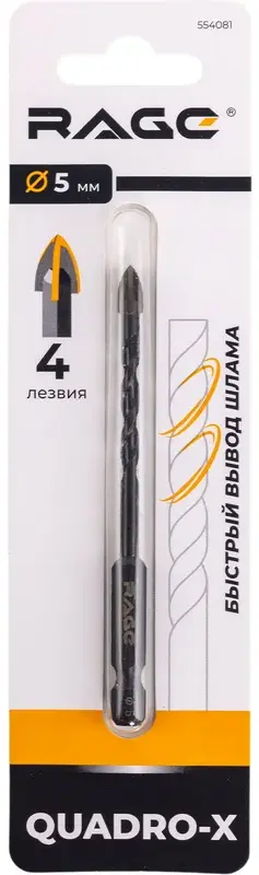 Сверло по стеклу и керамике 5 мм Quadro-X HEX копьевидное, спиральное RAGE 554081; УТ-00000375