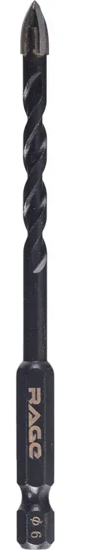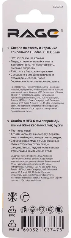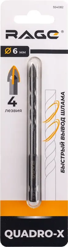Сверло по стеклу и керамике 6 мм Quadro-X HEX копьевидное, спиральное RAGE 554082; УТ-00000389