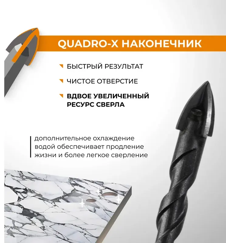 Сверло используется для сверления отверстий в стекле, мраморе, керамической и кафельной плитках.