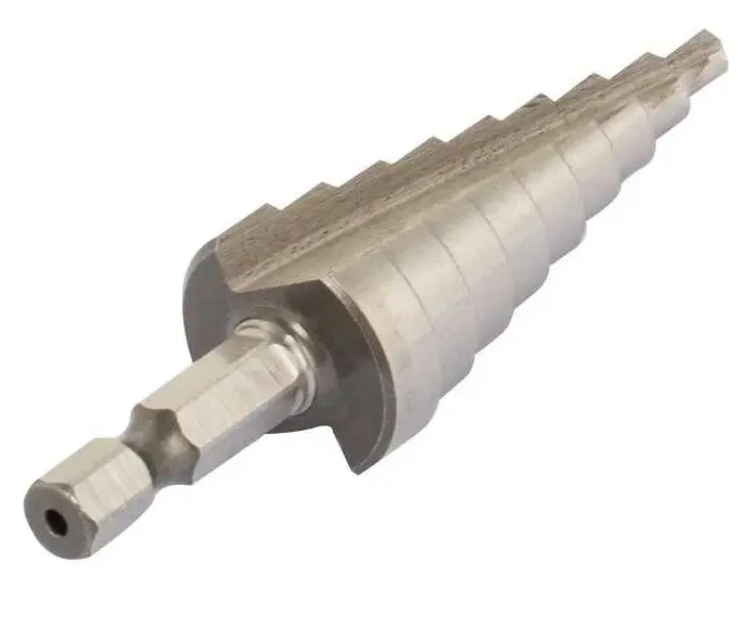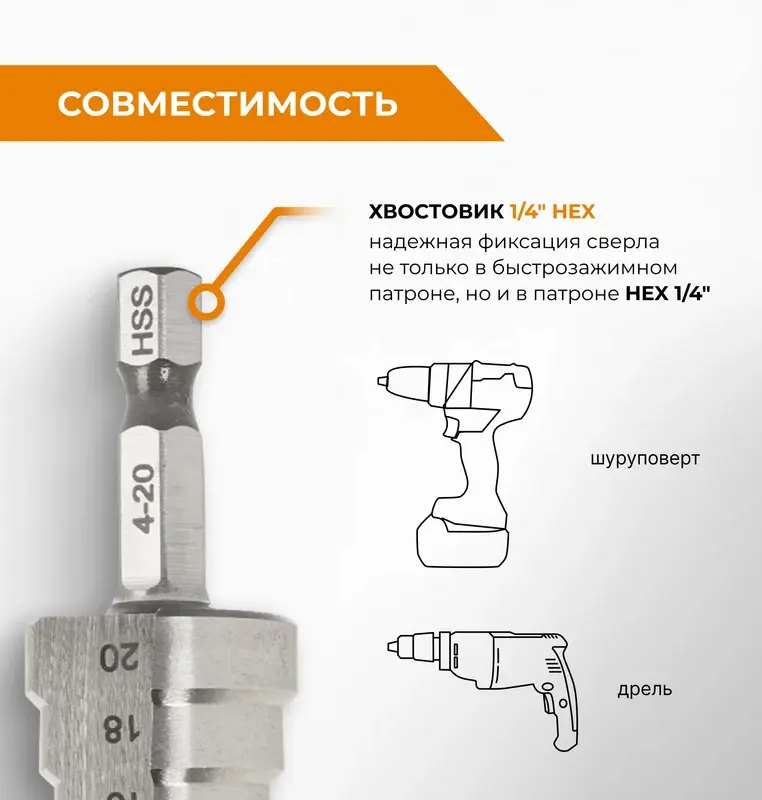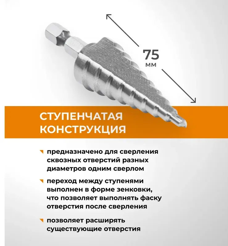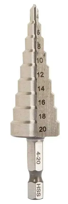 Сверло ступенчатое с шестигранным хвостовиком 1/4"HEX 4-20 мм VIRA предназначено для эффективного сверления тонколистового металла и цветных металлов, твёрдого пластика, древесины без деформаций. Сверло выполнено из высококачественной быстрорежущей легированной стали M2 (Р6М5) твердостью 63-65 HRC, которое увеличивает износостойкость инструмента. Надежную фиксацию сверла в патроне инструмента обеспечивает шестигранный хвостовик 1/4" HEX, который позволяет устанавливать его не только в электроинструмент с быстрозажимным патроном, но и с патронами типа НЕХ. Благодаря плавному ступенчатому переходу, сверло позволяет выполнять различные по диаметру отверстия (от 4 до 20 мм), не меняя каждый раз оснастку. А также применяется для расширения уже существующих отверстий.