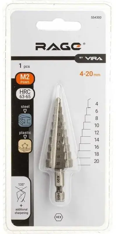 Сверло ступенчатое M2-TiN с шестигранным хвостовиком 4-20 мм RAGE by VIRA 554300; УТ-00000251