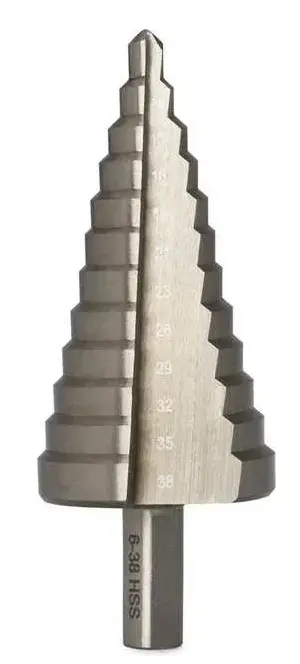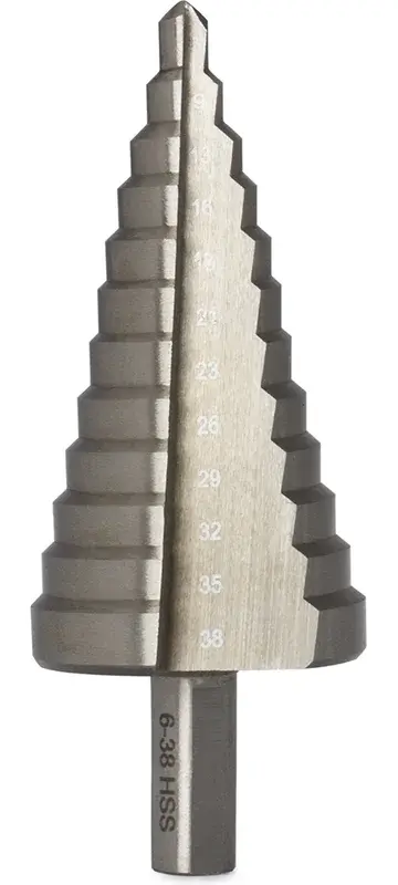 Сверло ступенчатое предназначено для эффективного сверлениятонколистового металла и цветных металлов, твёрдого пластика, древесины. Сверло выполнено из высококачественной быстрорежущей легированной стали HSS4241 твердостью 60-62 HRC, которое увеличивает износостойкость инструмента. Надежную фиксацию сверла в патроне инструмента обеспечивает трехгранный хвостовик, который позволяет устанавливать его во все электроинструменты, оснащённые быстрозажимным патроном.