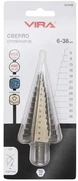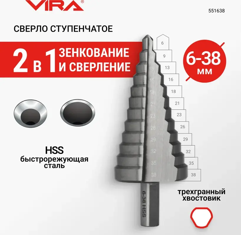 Сверло ступенчатое с трехгранным хвостовиком 6-38 мм VIRA 551638; УТ-00000255