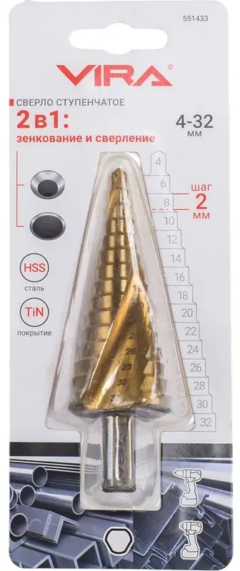 Сверло ступенчатое спиральное TiN с трёхгранным хвостовиком 4-32 мм VIRA 551433; УТ-00000256