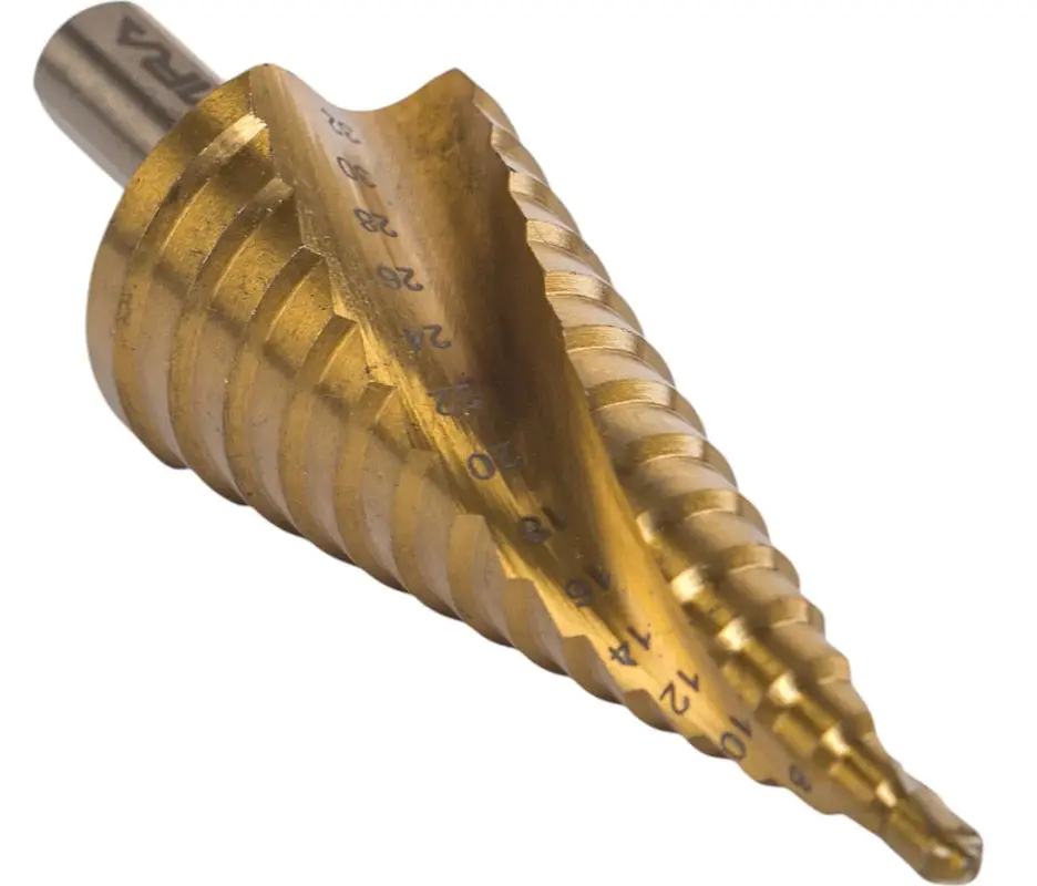 Ступенчатое сверло со спиральной канавкой предназначено для получения отверстий различного диаметра без перестановки режущего инструмента в изделиях из цветных металлов, тонколистовом металле и твердом пластике. Конструкция сверла обеспечивает оптимальный отвод стружки из зоны сверления. Специальная спиральная канавка служит для увеличения плавности и скорости работы по сравнению с обычным ступенчатым сверлом. Нитридтитановое покрытие обеспечивает дополнительную износостойкость. В результате увеличивается срок службы и качество работы.