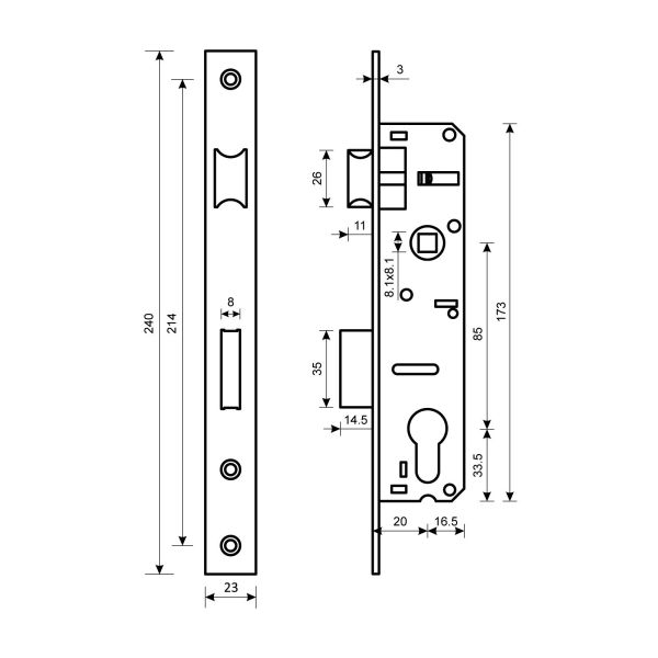 Замок врезной цилиндровый, без механизма. Предназначен для установки в узкопрофильные двери и калитки. Торцевая планка из нержавеющей стали SS201. Ответная планка в комплекте.- Тип механизма секретности цилиндровый